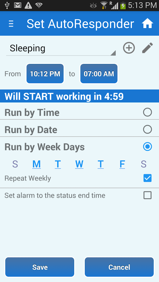 ✔ Set alarm for the end of the status – good for “sleeping” status